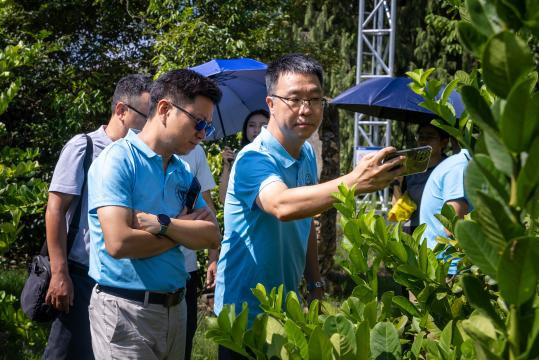 活动当日,教育学院党总支青年委员、学生党支部宣传委员、团委书记沈锶佩与广东省农技协监事长、教育学院叶宜生教授、学生代表朱炜国与省农技协专家一行,在周陂镇人民政府工作人员陪同下,首站抵达周陂镇特色香水柠檬与三华李种植基地开展现场调研。专家团队深入田间地头,与种植户进行面对面交流,细致了解作物培育、病虫害防治、产品深加工及市场销售等环节的具体情况与核心需求,为后续提供精准科技支持奠定了坚实基础。